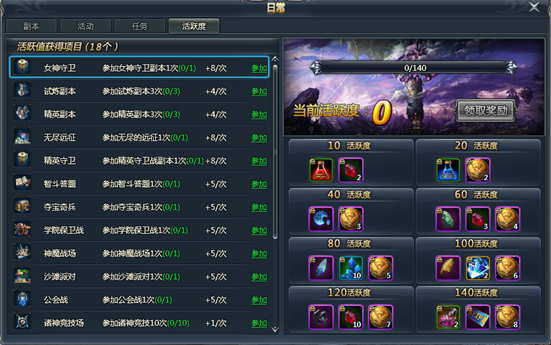 1.活躍度:記錄了玩家可以獲得活躍值的項目,記錄當前活動、任務和副本的完成情況,同時根據日常完成情況計算活躍值,領取活躍度獎勵,活躍度禮包非常豐厚,獎勵多多。