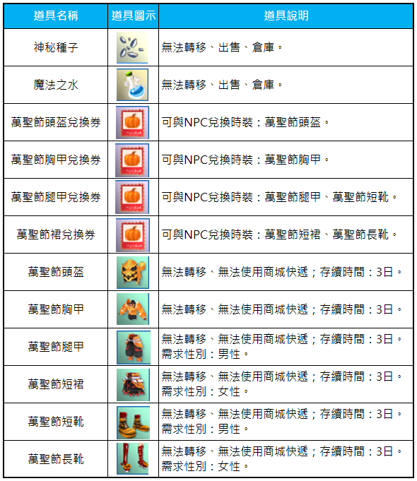 - 打倒怪物【小魔鬼】會隨機掉落萬聖節時裝各部位的兌換券,身上有兌換券的玩家可以NPC【壞人】兌換萬聖節時裝。