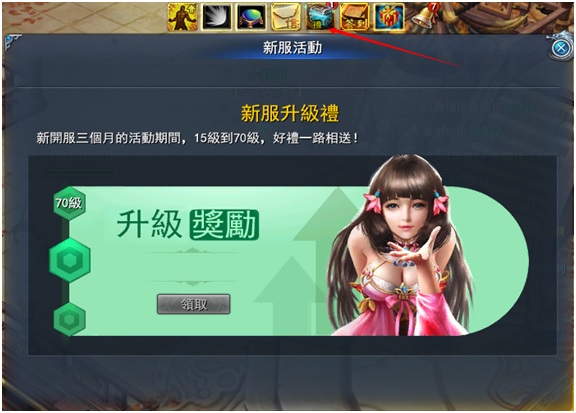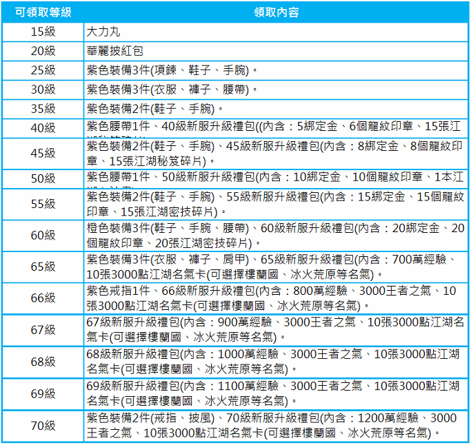 衝等封頂 邁向豐富獎勵之路 活動時間:2015年10月9日11:00【S02海天一色】正式開機後,至 2015年12月30日23:59分止。 活動方式: 1.於活動期間創立角色,只要等級達到一定標準時,即可領取一次升級獎勵。 2.玩家角色達領取標準時,系統會出現提示,玩家點選後即可進入獎勵領取視窗。 3.角色達到以下等級,即可獲得對應獎勵: 《武魂2 Online》營運團隊敬上